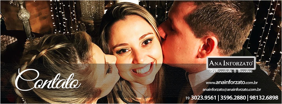Entre em contato com Ana Inforzado Cerimoniais & Eventos: E-mail: contato@anainforzato.com.br Telefones: (19) 3023.9561 | 3596.2880 Celular/WhatsApp: (19) 98132.6898 Formulário de Contato: